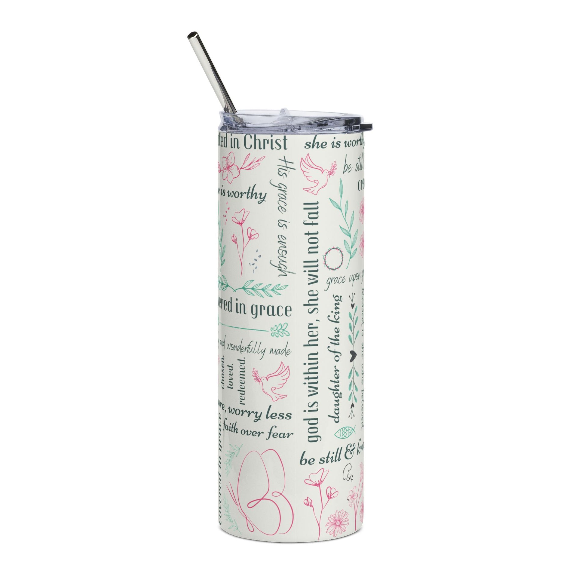 A slim 20 oz stainless steel tumbler wrapped in soft, faith-forward artwork that reads like a pocket-sized chapel. Gentle mint and rose hues frame a painted cross with a heart at its center, surrounded by handwritten scripture phrases and floral accents. It keeps your drink close while offering quiet encouragement throughout the day — whether you sip during a busy commute, tuck it into your car cup holder, or cradle it while journaling on a porch. The glossy protective finish preserves the art, and the included lid and metal straw make it easy to drink on the go without losing the calming, hopeful message.