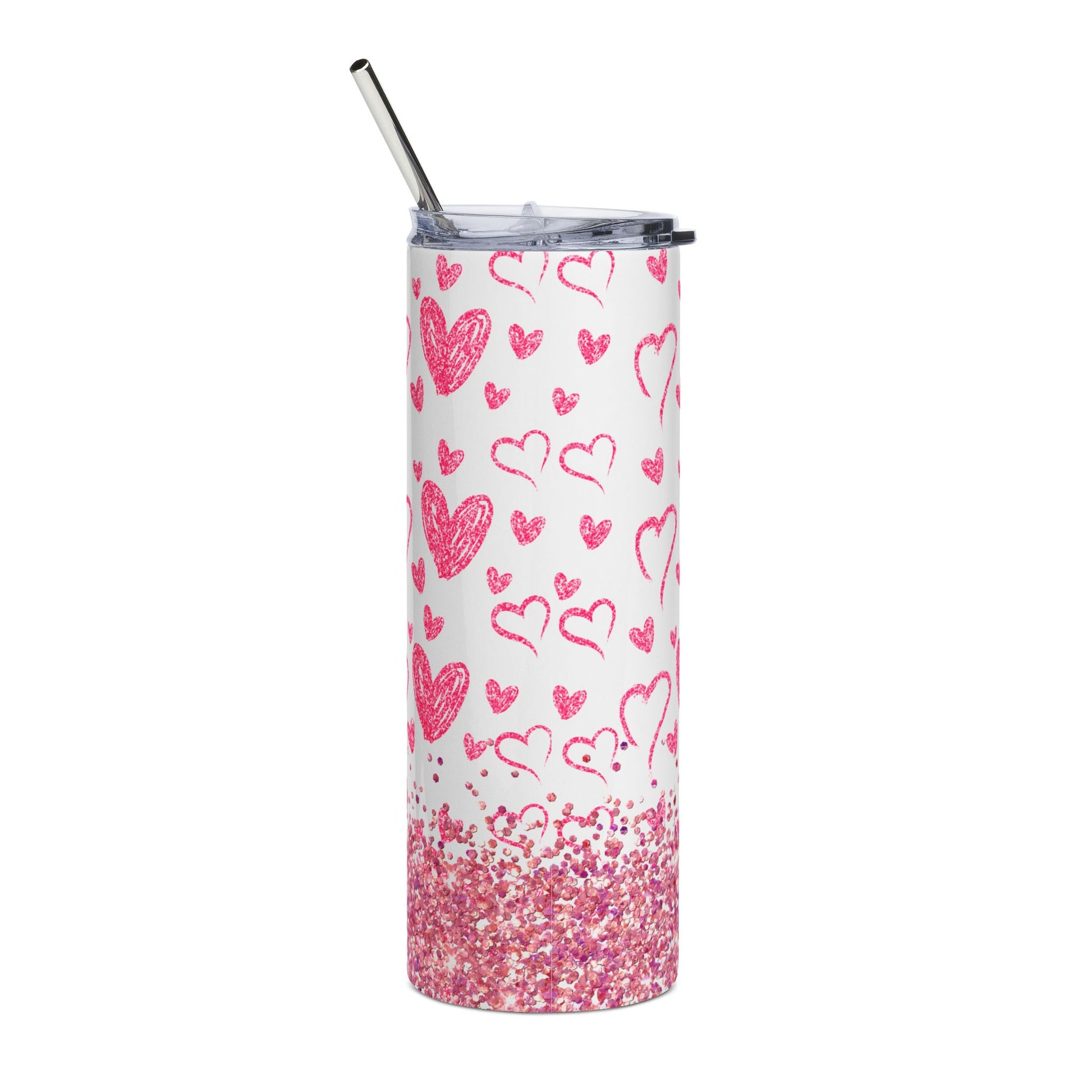 A slim 20 oz stainless steel tumbler wrapped in hand-drawn pink hearts and a glitter-dusted base. Lightweight and cylindrical, it slips into narrow cup holders and holds a full serving for mornings on the go. The clear lid and included straw make sipping simple while the glossy protective layer keeps the cheerful print bright through daily use. Carry it to coffee runs, craft markets, or cozy afternoons curled up with a book — it adds a playful, romantic note to everyday routines.